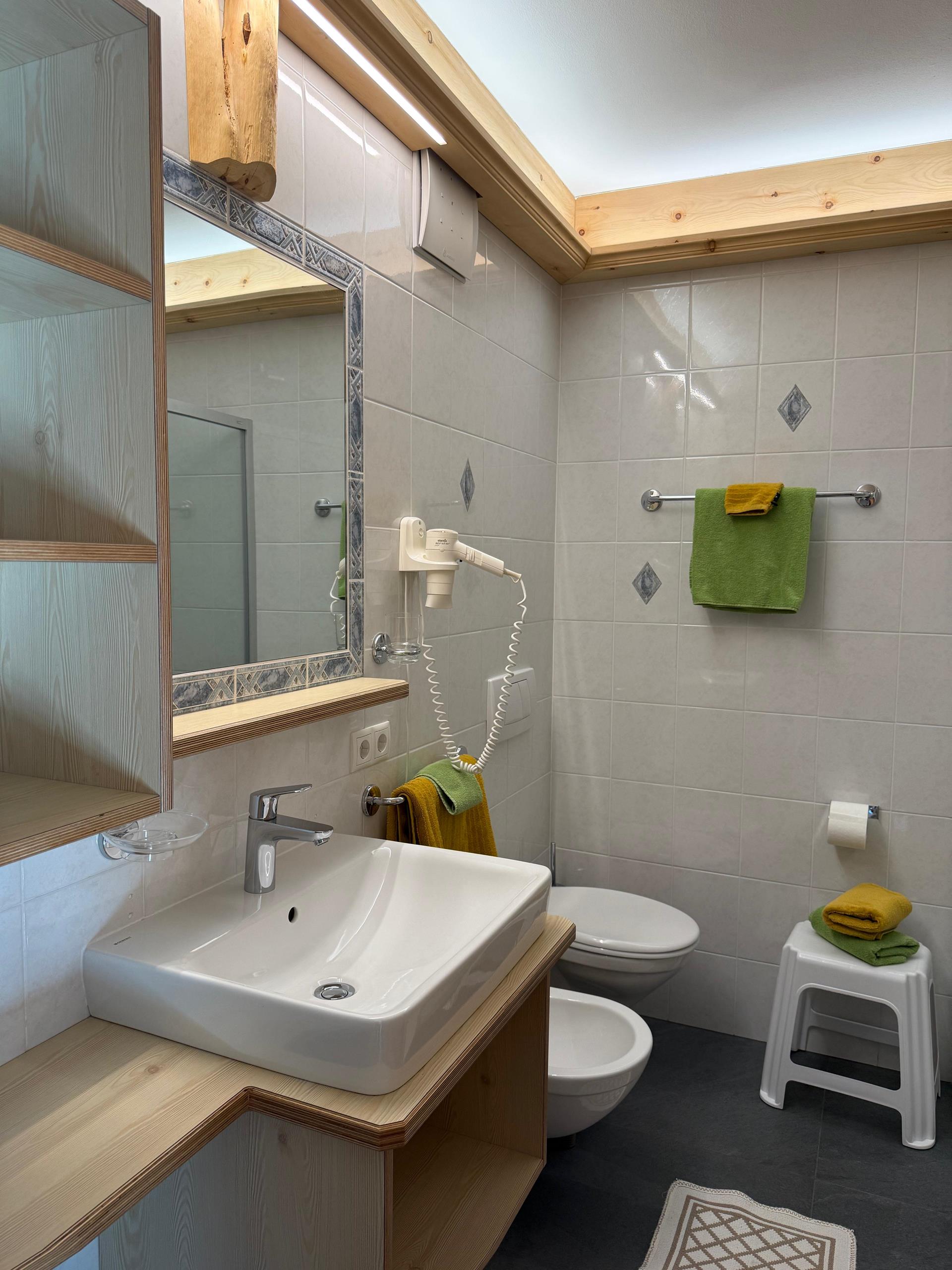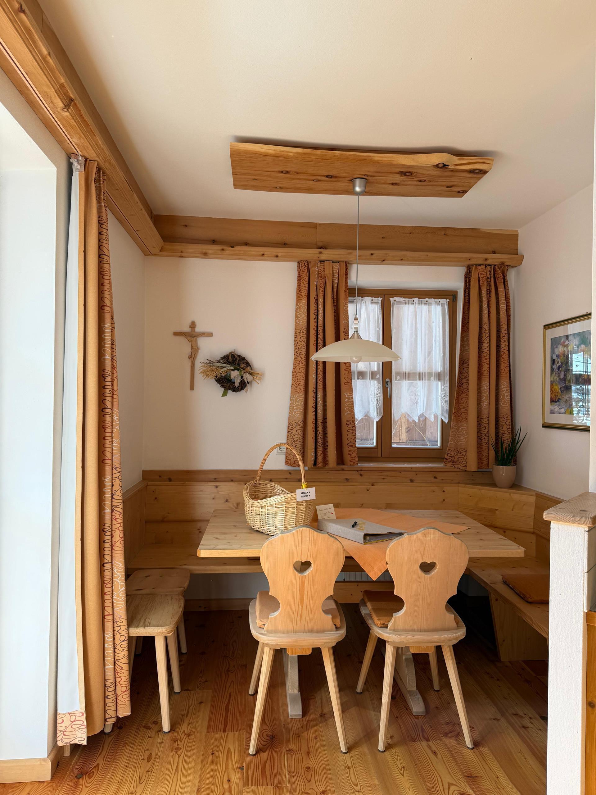 The self-catering apartment Enzian in the attic offers a kitchen and living area with sitting area and sofa-bed for 2 people, a bedroom with three beds and a room with bunk bedsor pull-out double bed for 2 people. The bathroom is equipped with a shower, hair dryer, toilet, bidet and sink. The southwest facing balcony affords views of the Sarntal Alps.