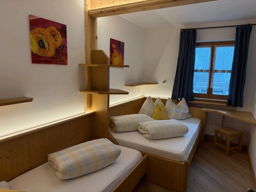 Situato in mansarda, l'appartamento Margherita è composto da un'accogliente cucina abitabile con angolo salotto e divano letto per 2 persone, da 2 camere da letto (una matrimoniale e una con letto a castello per 2 persone) e da una stanza da bagno con doccia, asciugacapelli, WC, bidet e lavabo. Il balcone rivolto a sud offre una vista meravigliosa sul bosco e sui prati.